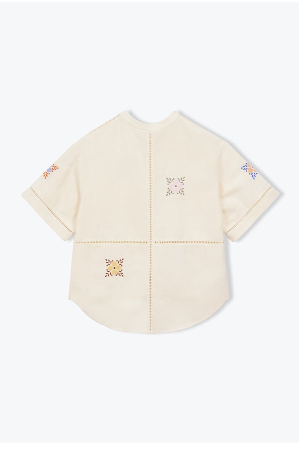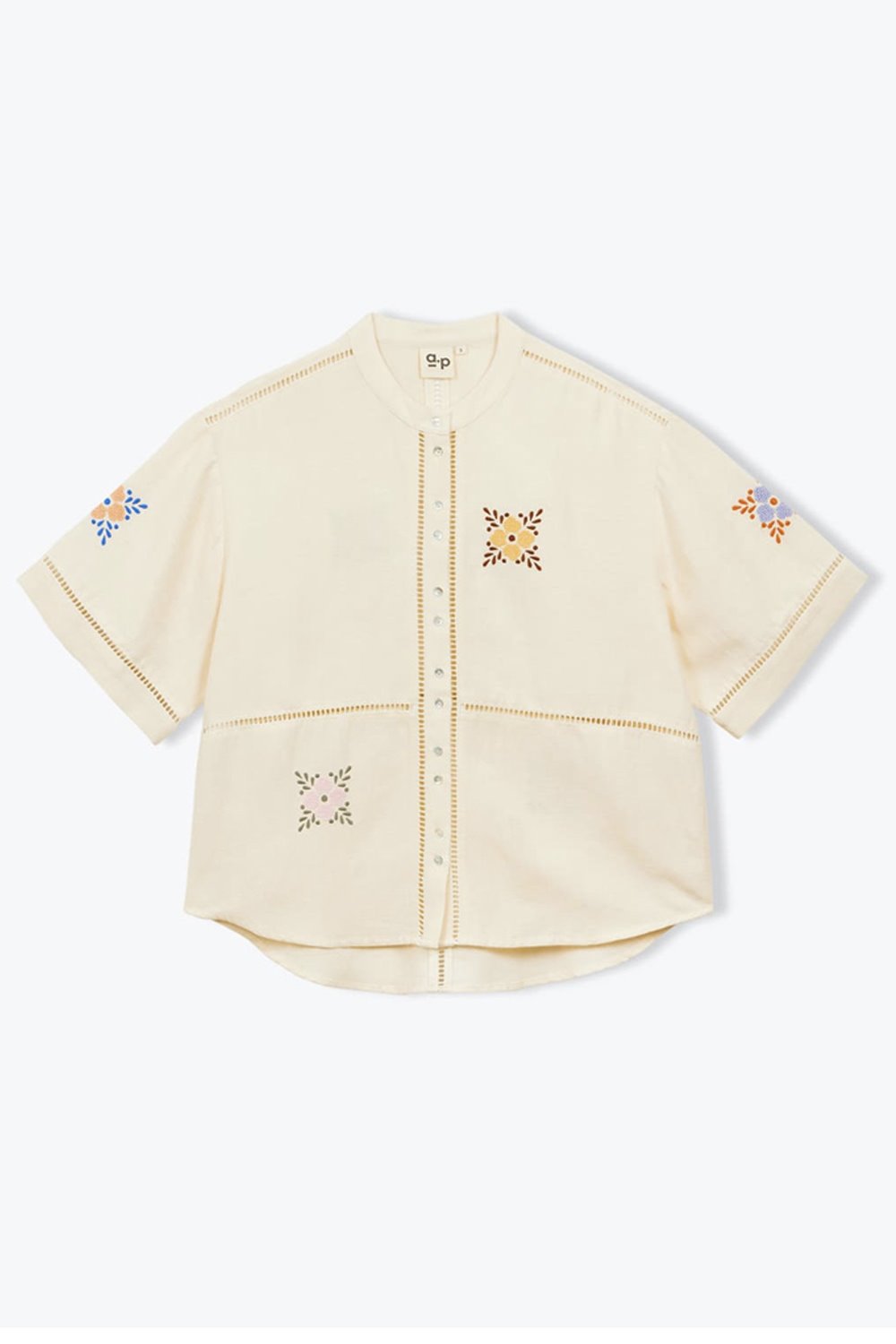 A collarless shirt style with embroidery to the front and back and intricate crochet details. A mid-weight linen/cotton blend.