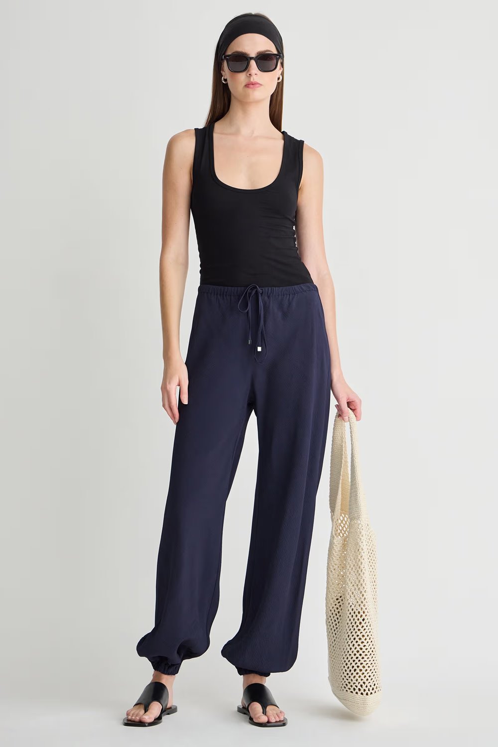 A soft balloon shape pant with elasticated cuffs and drawstring fastening at the waist. Cut in a drapey Italian viscose fabric with a hint of stretch for a luxe fit.