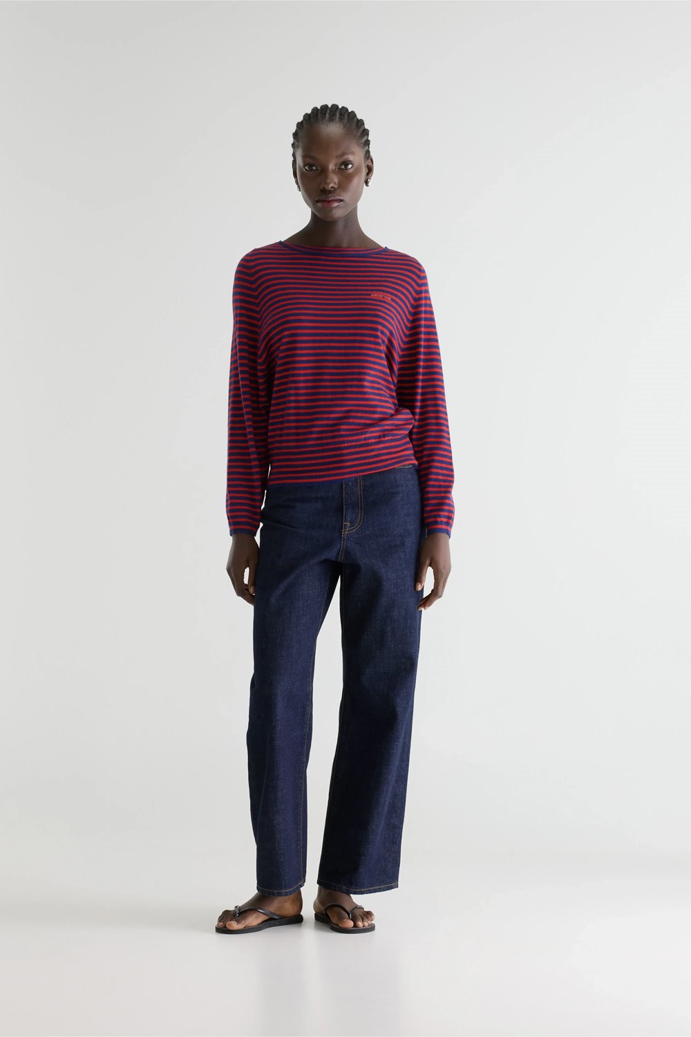 A fine-gauge knit in a classic red and navy stripe. A boat neck style in a relaxed fit with ribbed cuffs and hem.