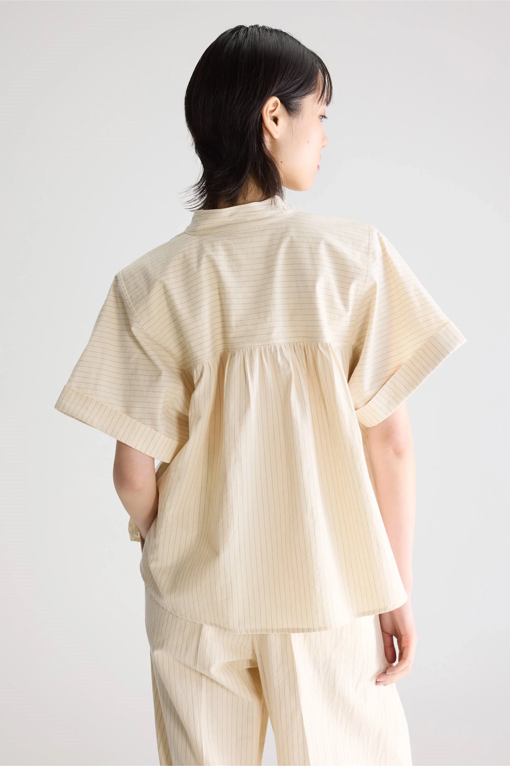 A pinstripe blouse with gathered shoulder seams and a half-open collar. Cut in a cotton blend, the Pear has a regular fit with short sleeves and side slits at the hem. Seen here in a soft creamy ecru with a grey/blue stripe.