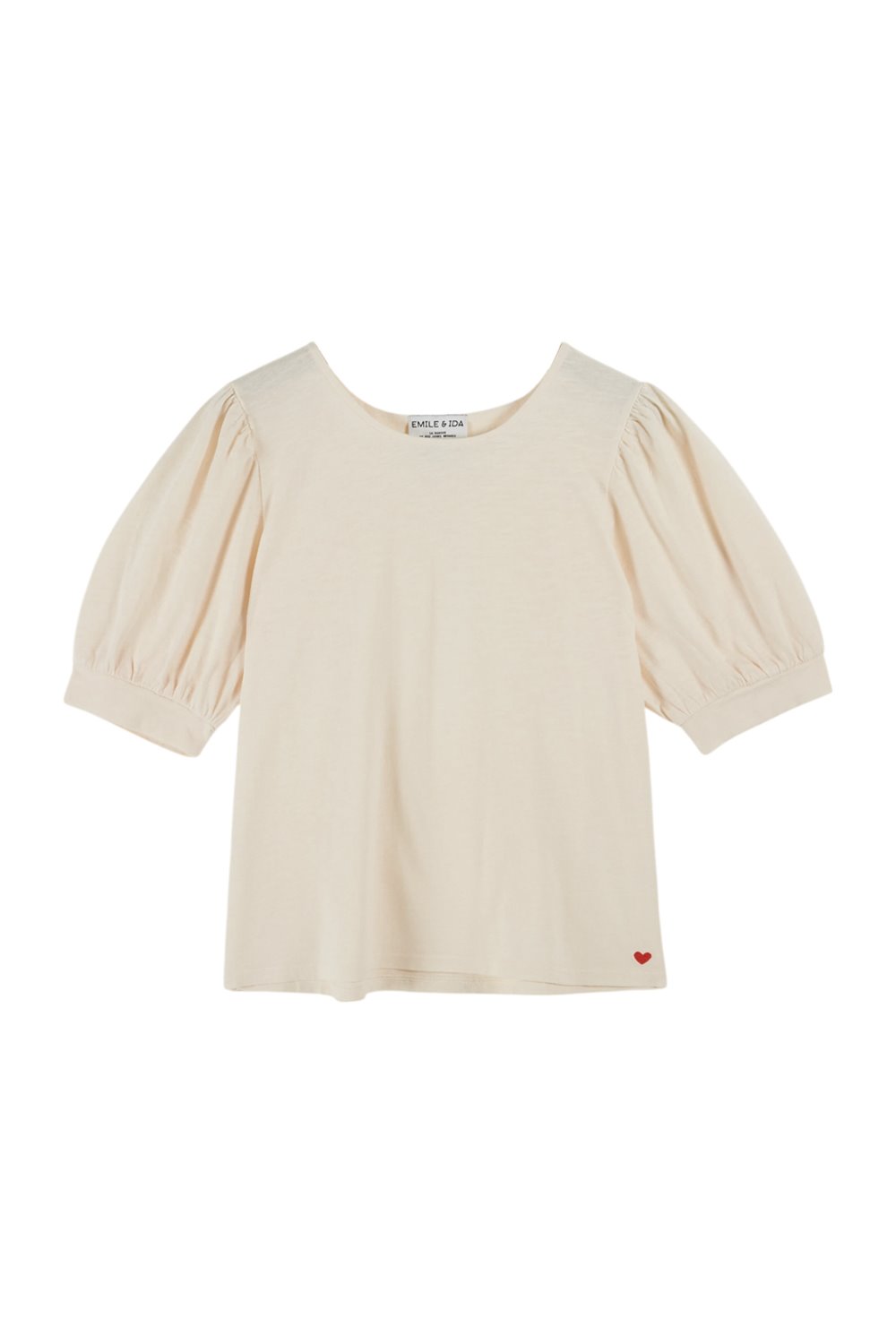 A cream organic cotton tee with balloon sleeves. A round neckline and 3/4 length sleeves, the Dimitri has a loose flowy shape with gathered details at the back yoke. A small heart embroidered at the bottom hem.