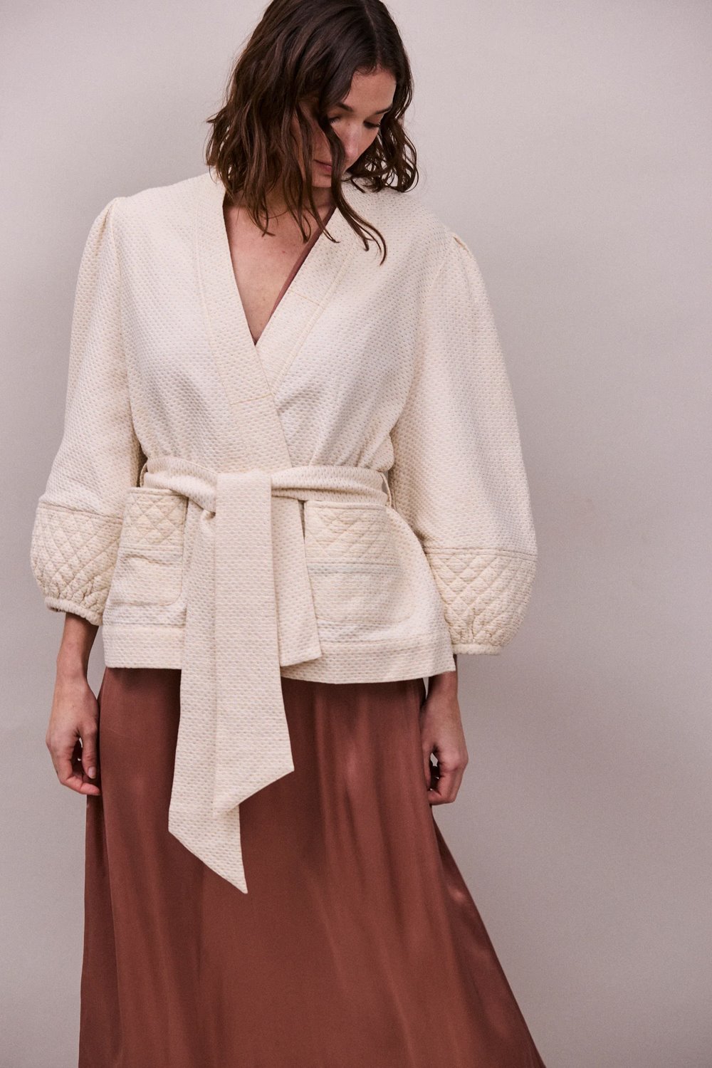 A signature Faune piece, the Deia has. soft structured look with a relaxed silhouette. Featuring a tie belt and quilted cuffs. A soft cream colour with a subtle gold thread.