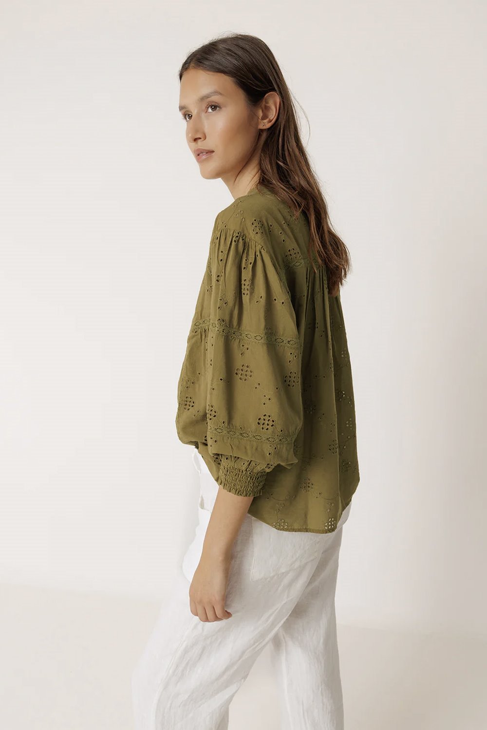 A long-sleeve shirt with a small ruffle at the neckline and lace inserts throughout. Schiffi embroidery on a soft cotton voile fabric. A relaxed, slightly loose fit.