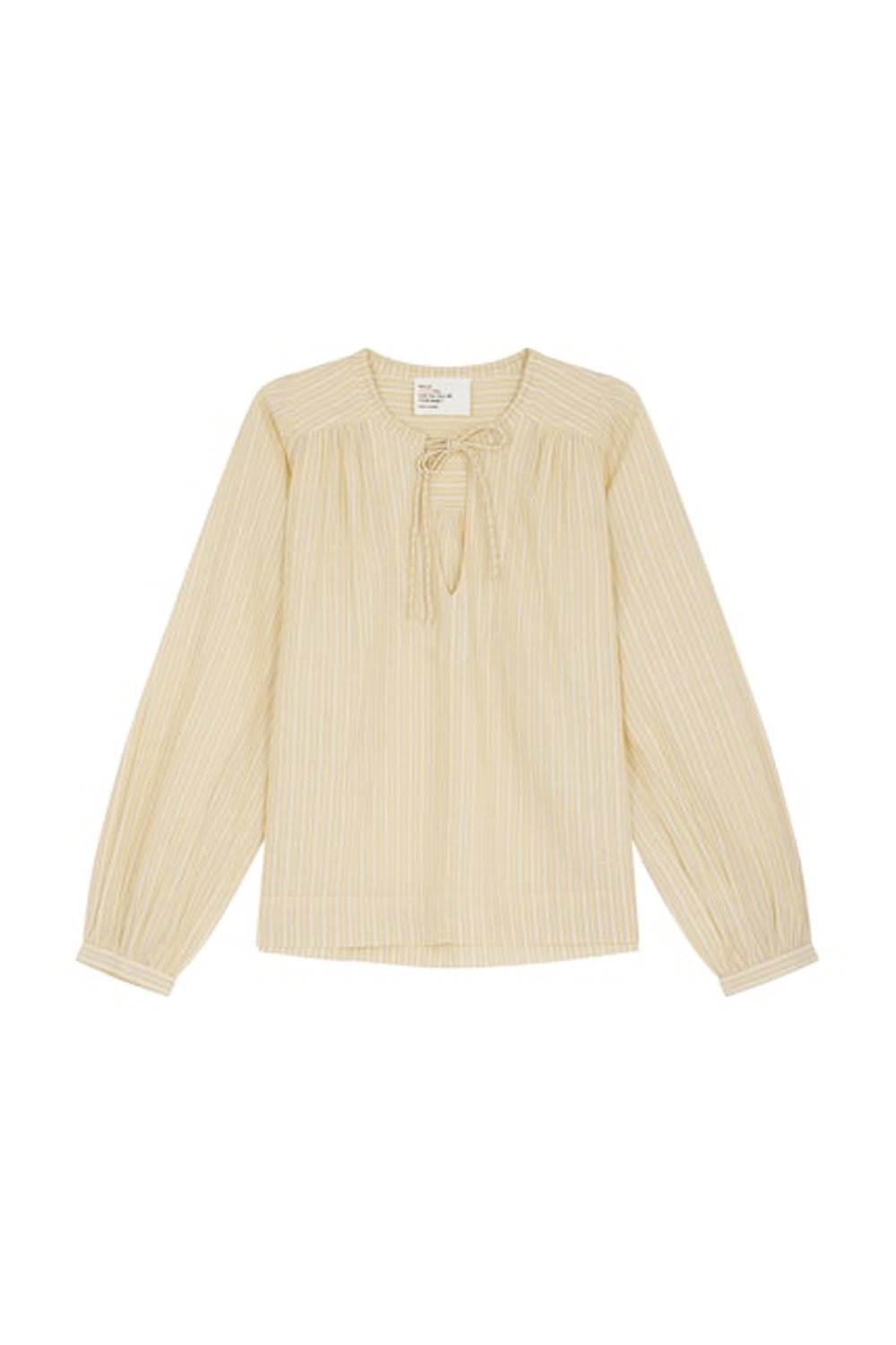A pretty yellow shirt is a cool cotton stripe. Tie neckline and elastic cuff sleeves