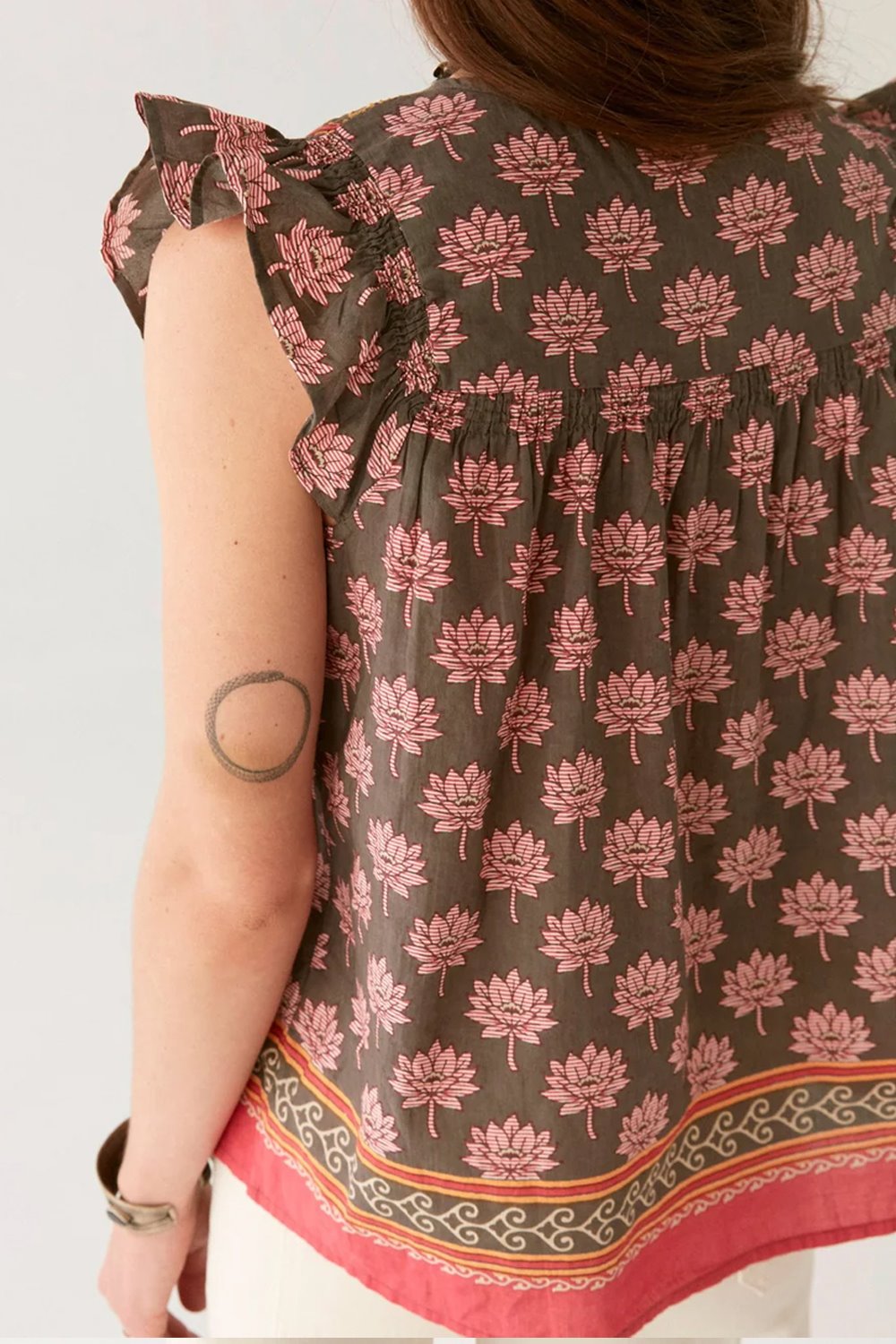 A printed cotton sleeveless blouse with a heritage feel. Cut in a deep earthy brown with delicate lotus print motifs. Flutter sleeves and intricate embroidery along the shoulders and a border print adding a contrast.