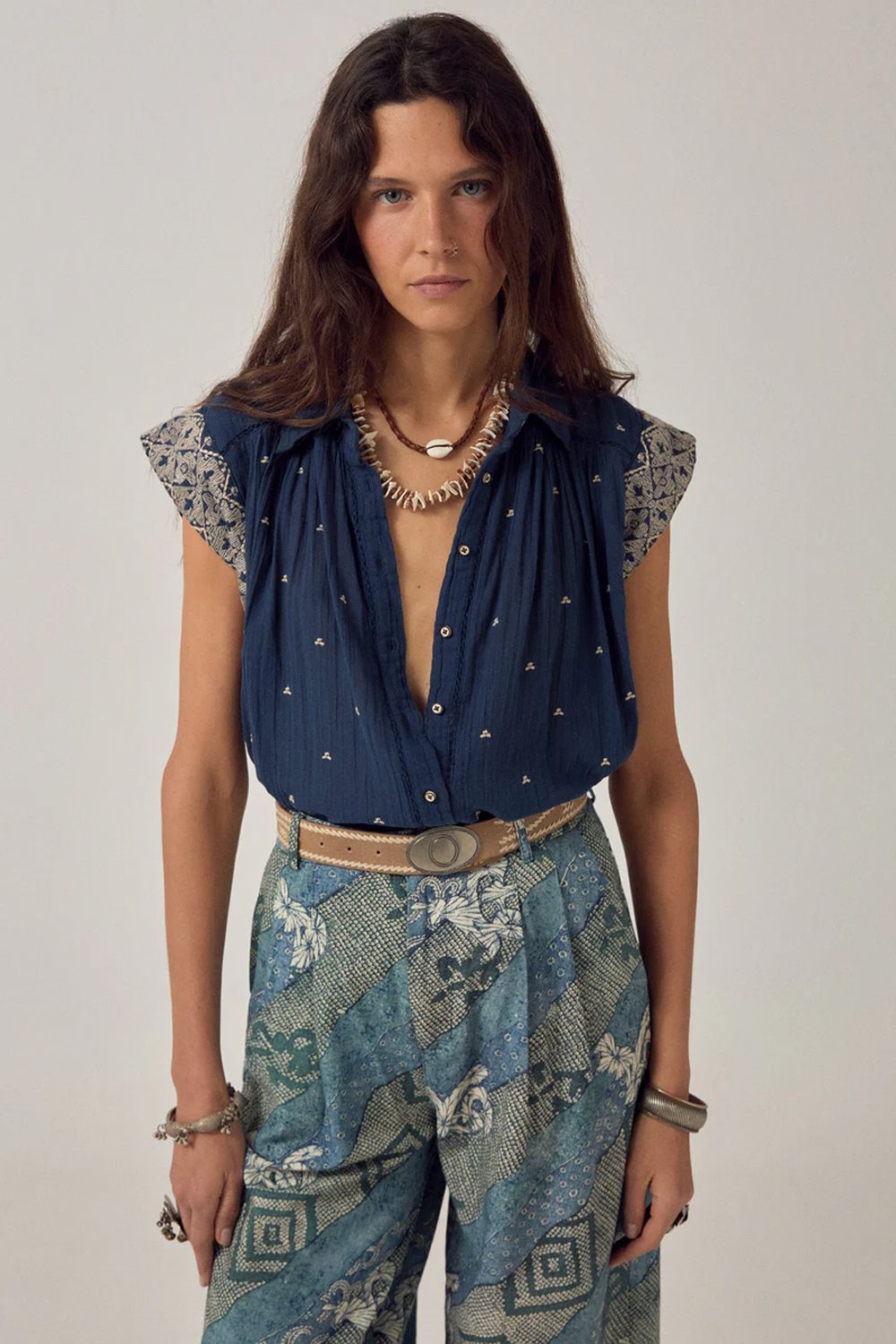 A pretty sleeveless blouse in a deep inky blue. Lace panels at the shoulders.