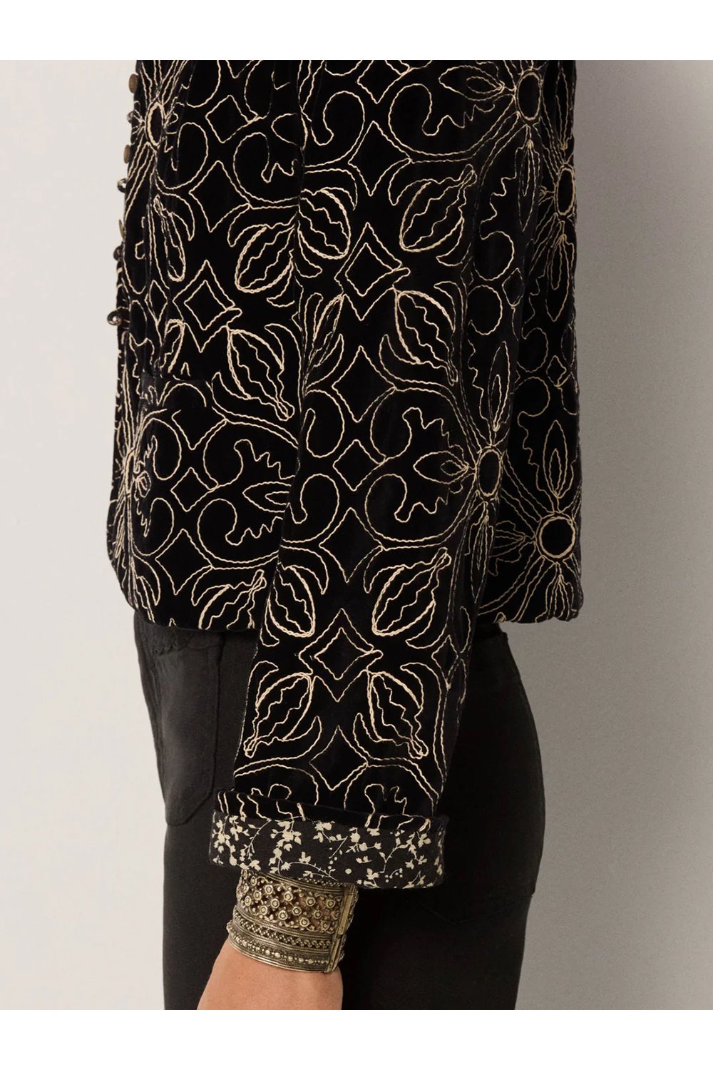 Make a statement with the Odette Jacket by Maison Hotel. Velvet, cropped and richly embroidered, the perfect piece for elevated evening wear.