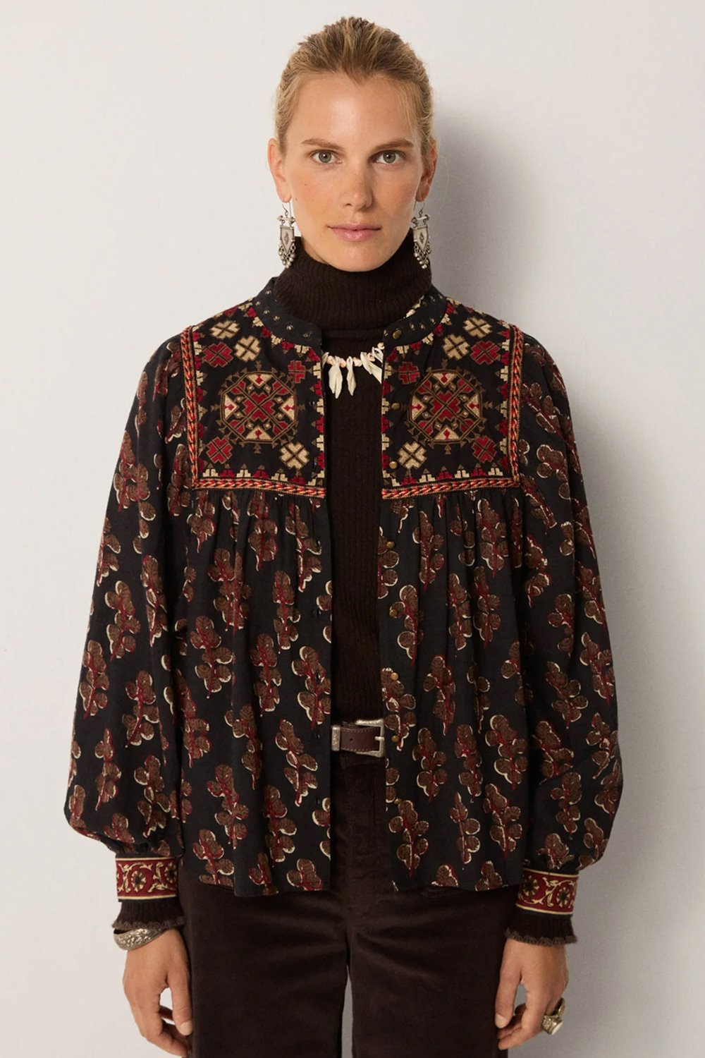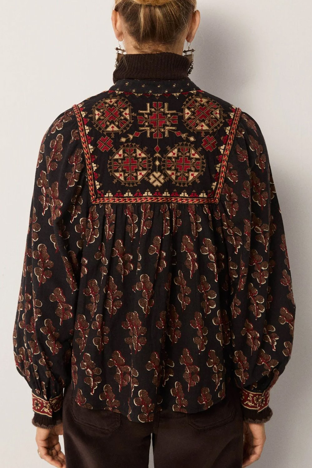 A soft cotton voile shape in a vintage inspired fabric. A relaxed fit silhouette with gentle gathers and geometric yoke.