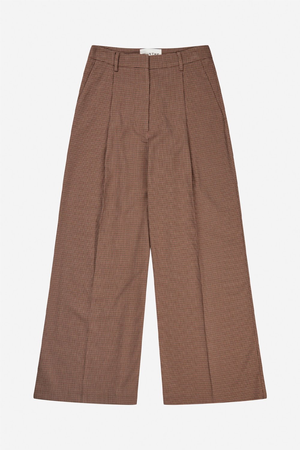 A cool check trouser with a wide leg and elegant pleats to the front. Side pockets and belt loops, zip closure. A viscose blend drapey fabric give the style a refined look. The Lupon trousers will pair effortlessly with knits and shirts alike.