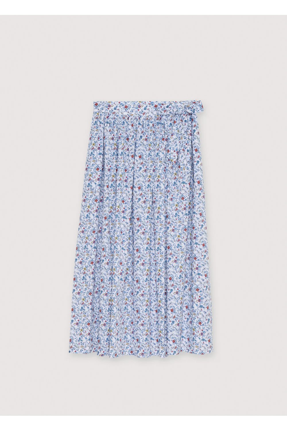 A long blue floral skirt with an easy flowy shape.