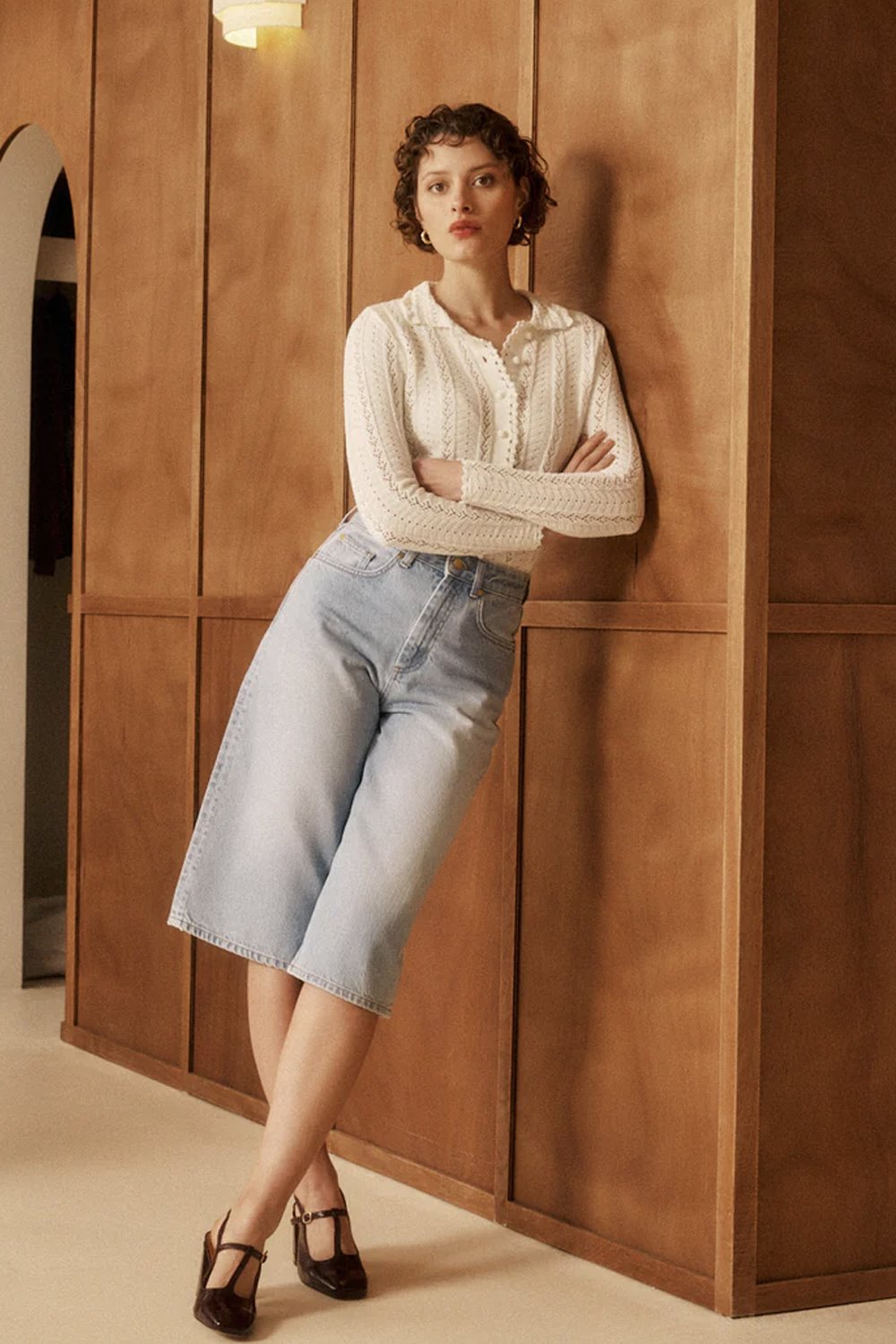 A pretty openwork knit top with a polo collar and long sleeves. A fitted style with button fastenings and scalloped edges.