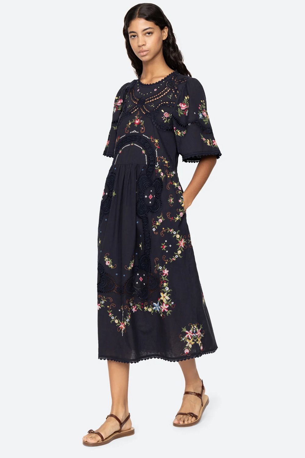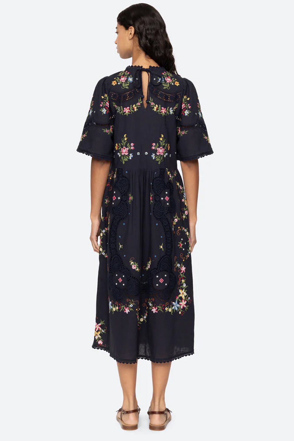 A short sleeve dress with beautiful cross stitch embroidery and lace inserts. Ties to the back and a side zip fastening. Cut in a mid weight cotton, the Edwina dress is a loose fit style with flattering waist detailing and scallop edging.