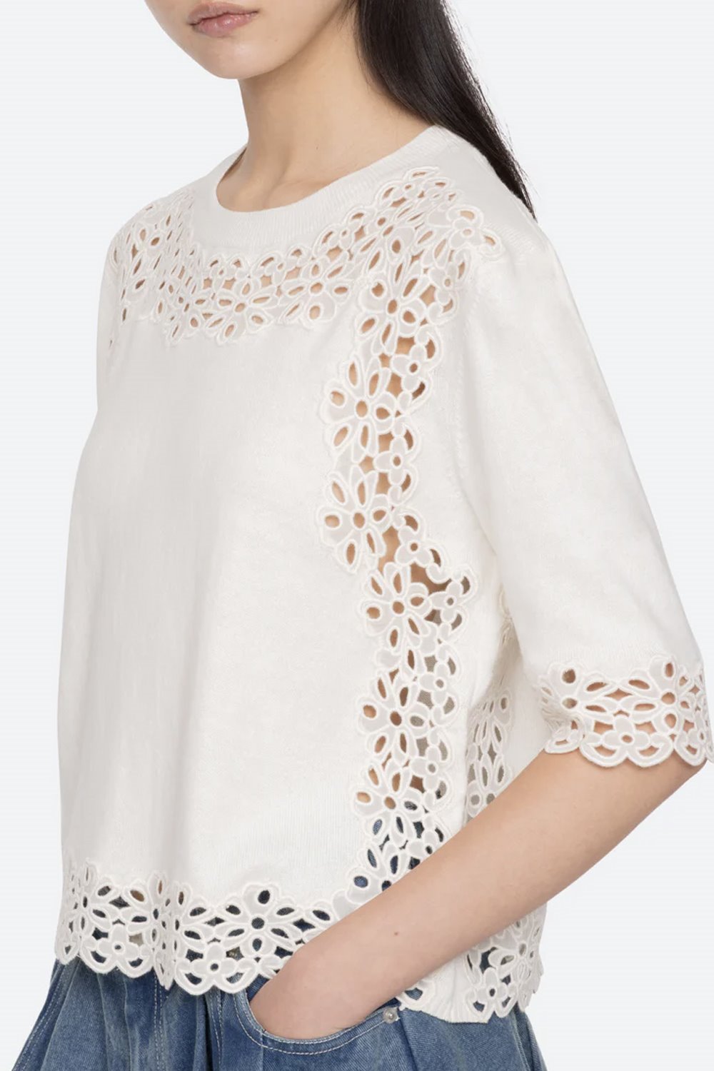A short-sleeve knit from Sea with delicate floral eyelet detailing. A slip on shape and designed for a relaxed fit.
