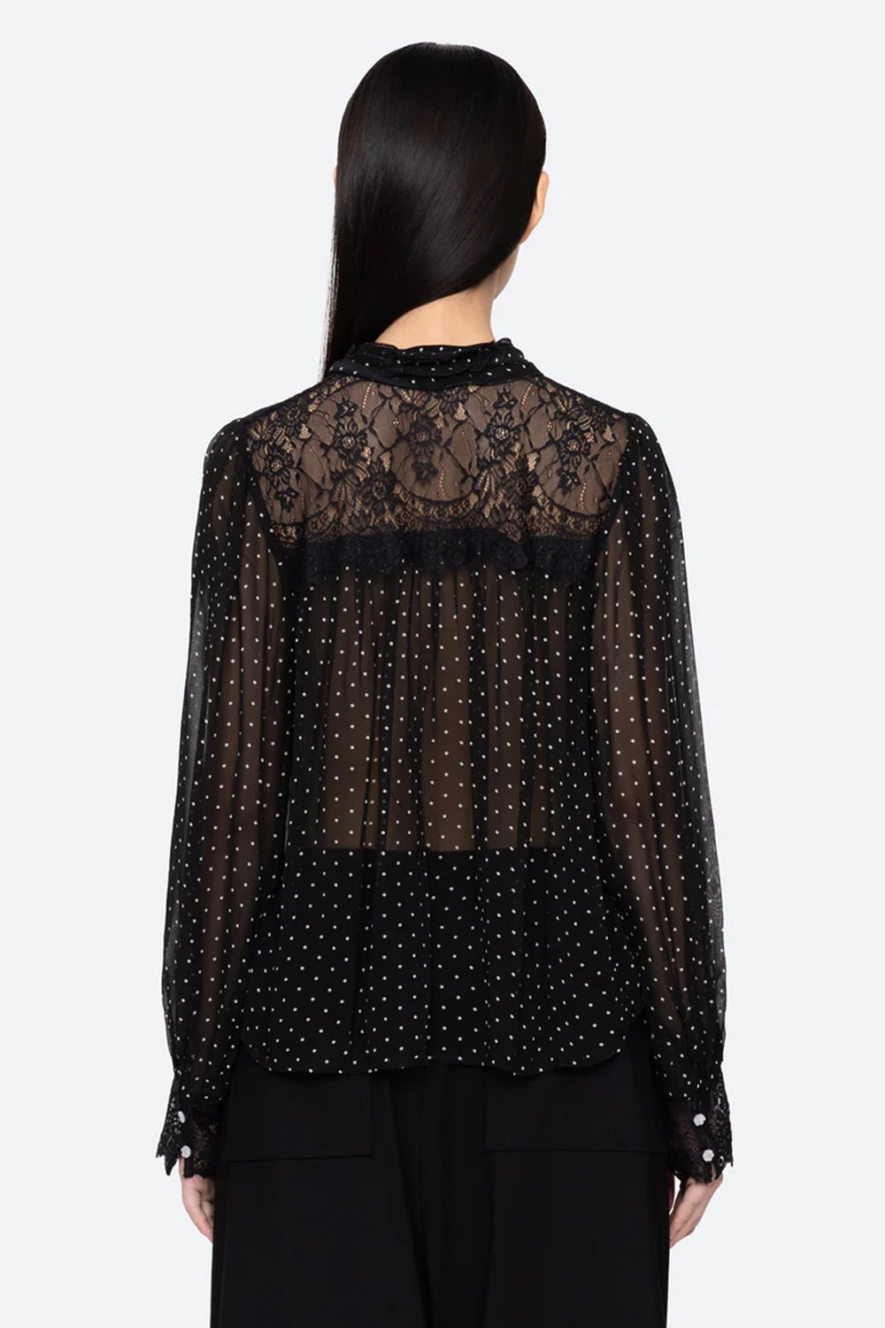 A pretty and dramatic polka dot blouse with delicate lace inserts. The blouse features floral buttons, a button-front fastening, and a self-tie closure at the neckline. A relaxed drapey fit.