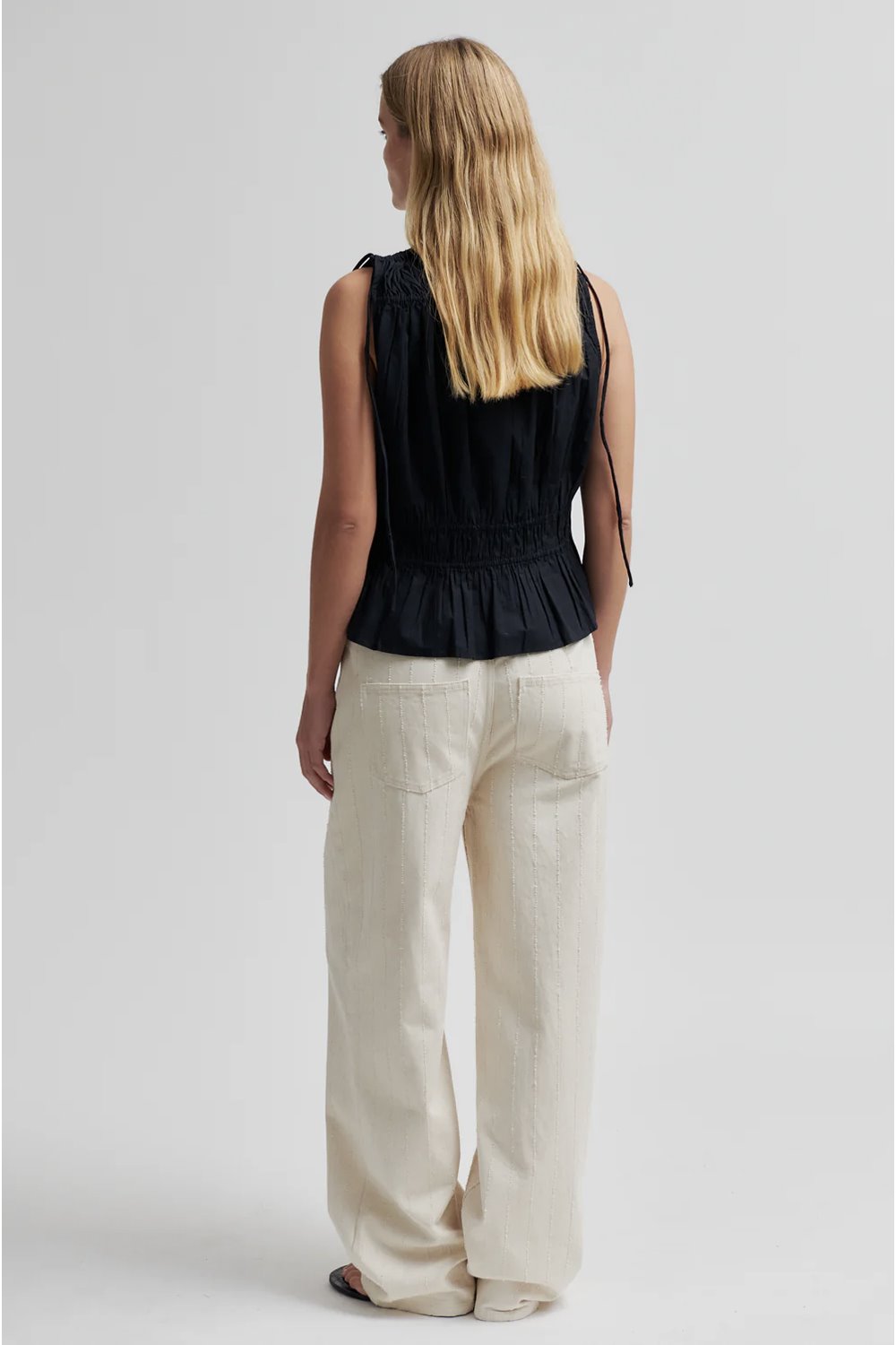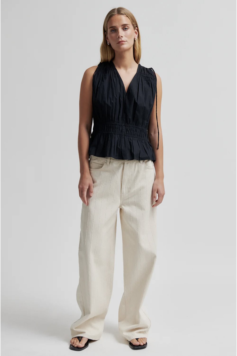 A cotton peplum-shaped top with a flattering V-neck and a drawstring tie at the shoulders. Elasticated seams at the waist to create a peplum effect.