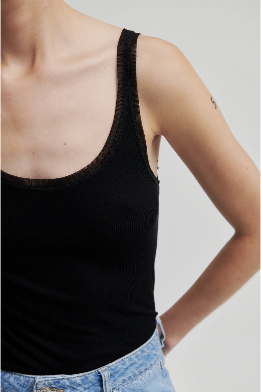 A soft, fine-ribbed tank top cut from stretchy viscose. With a deep scoop neck and fin shoulder straps featuring a sheer mesh trim.