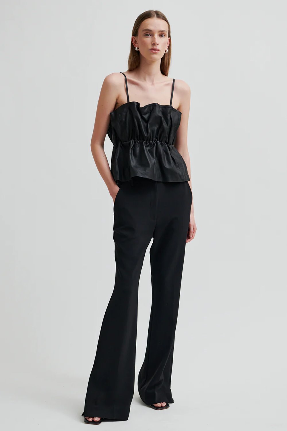 Cut from a smooth, drapey fabric, the Fique bootcut features a mid-waist shape with a slight bootcut. Featuring a concealed zip, hook and button closure.