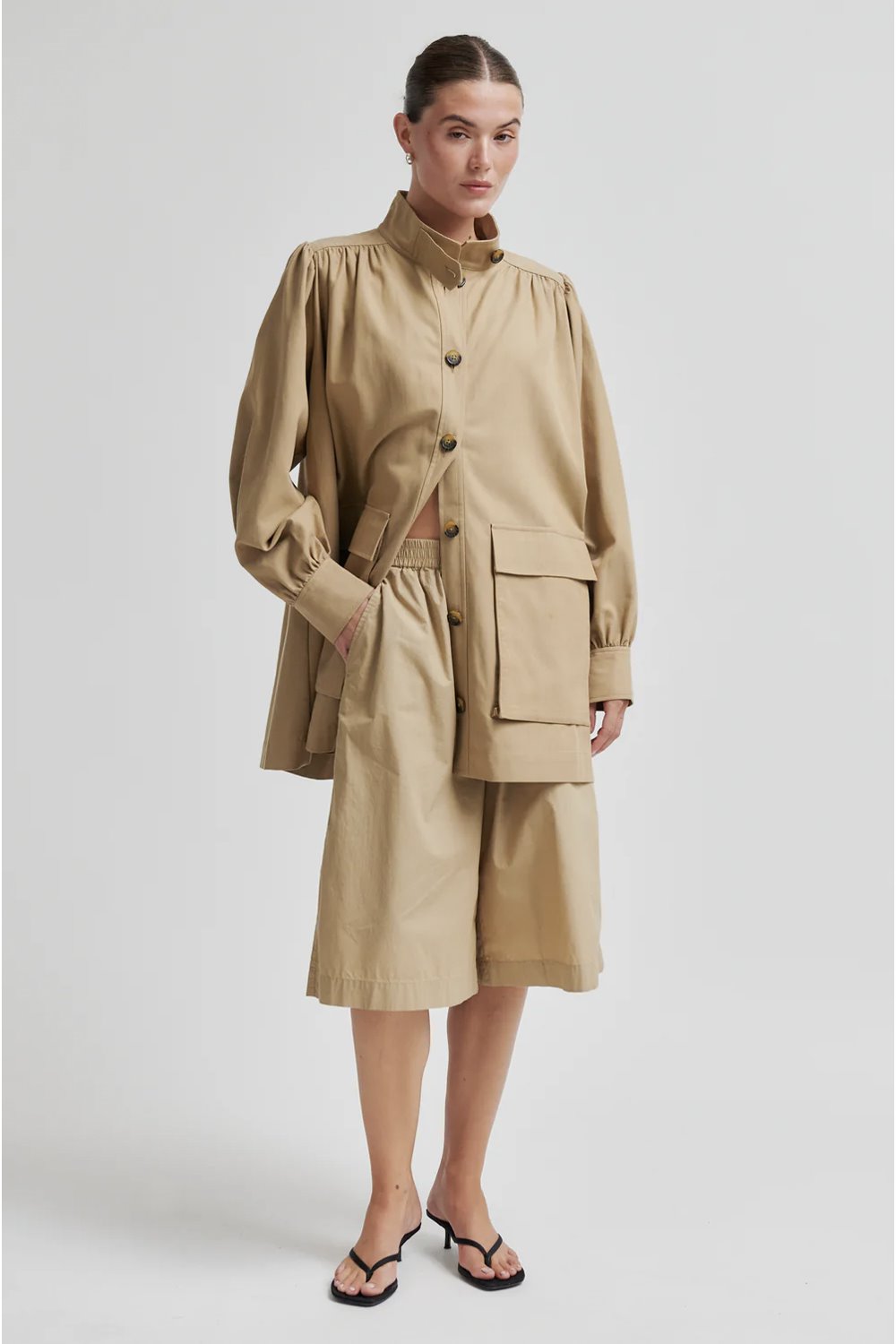 A lightweight Spring jacket from Second Female cut in a smooth cotton blend. Featuring a high neck and button-through fastening and pockets. Gathered shoulders, long sleeves with buttoned cuffs.