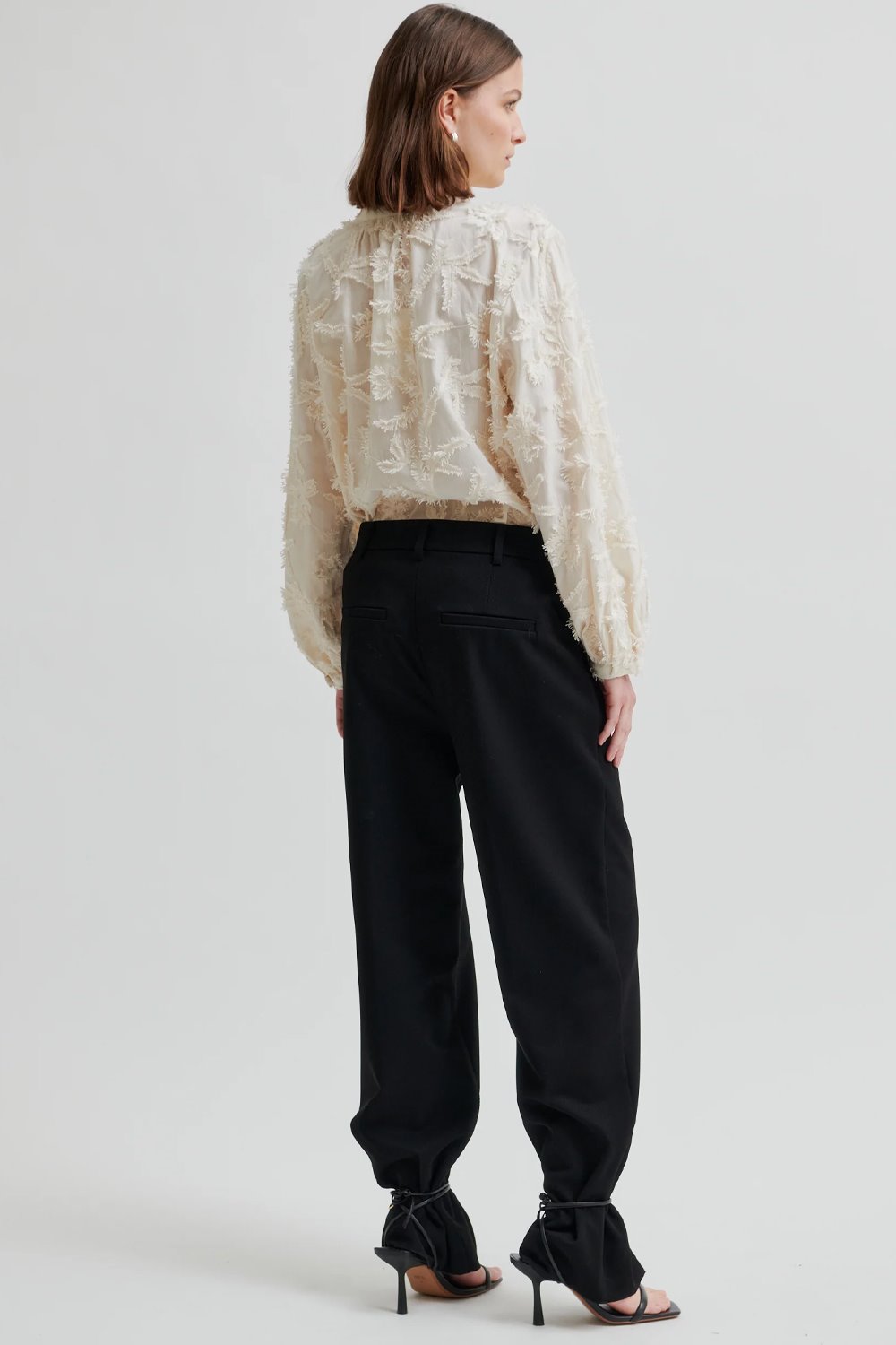 A smooth blend cotton shirt with a 3D structured leaf pattern. Featuring a round collar and button-through front. Elastic ruched long sleeves. A perfect party season piece.