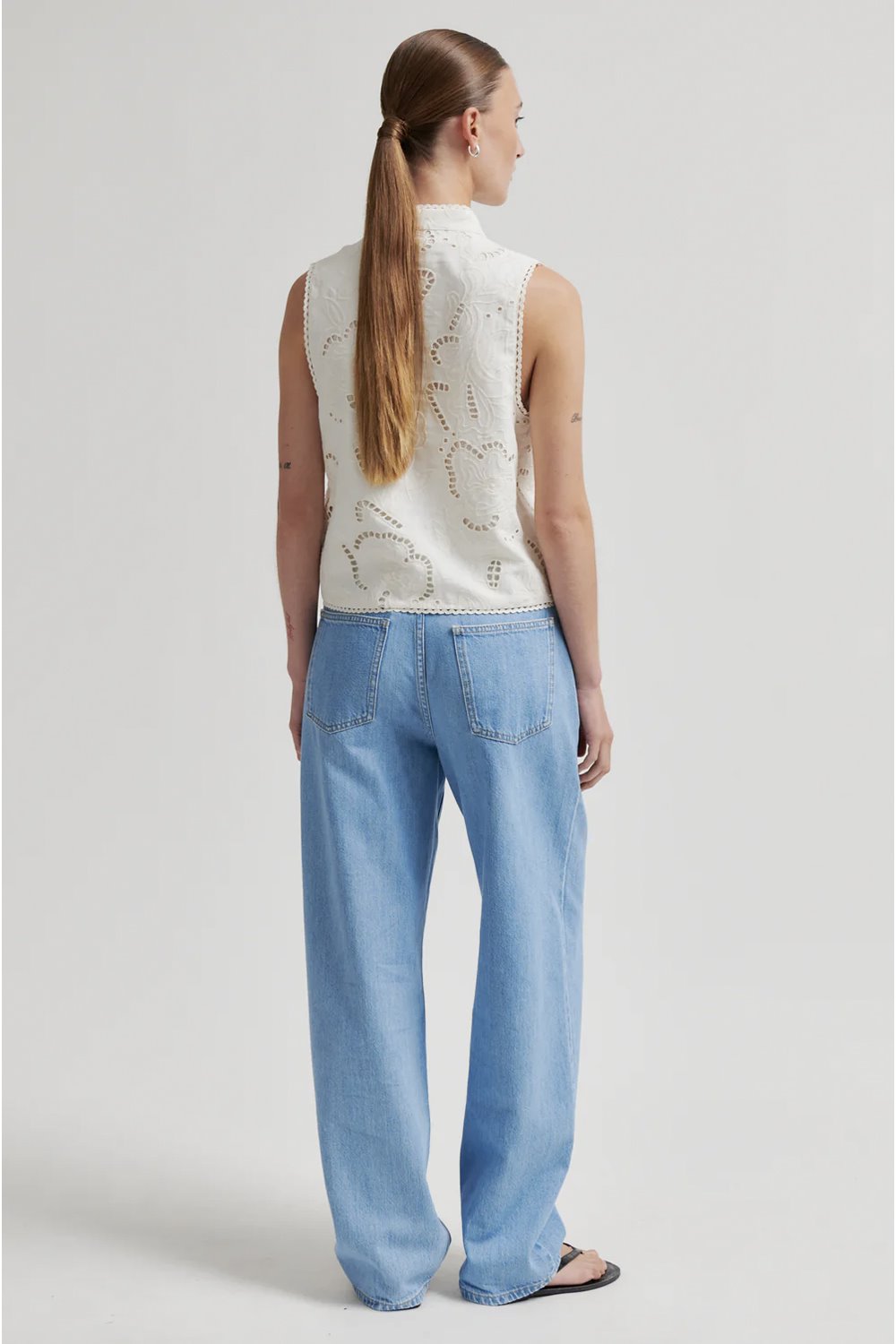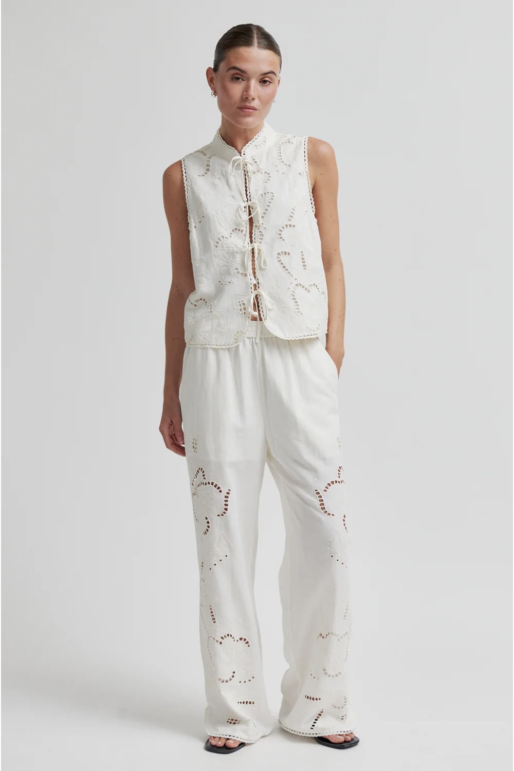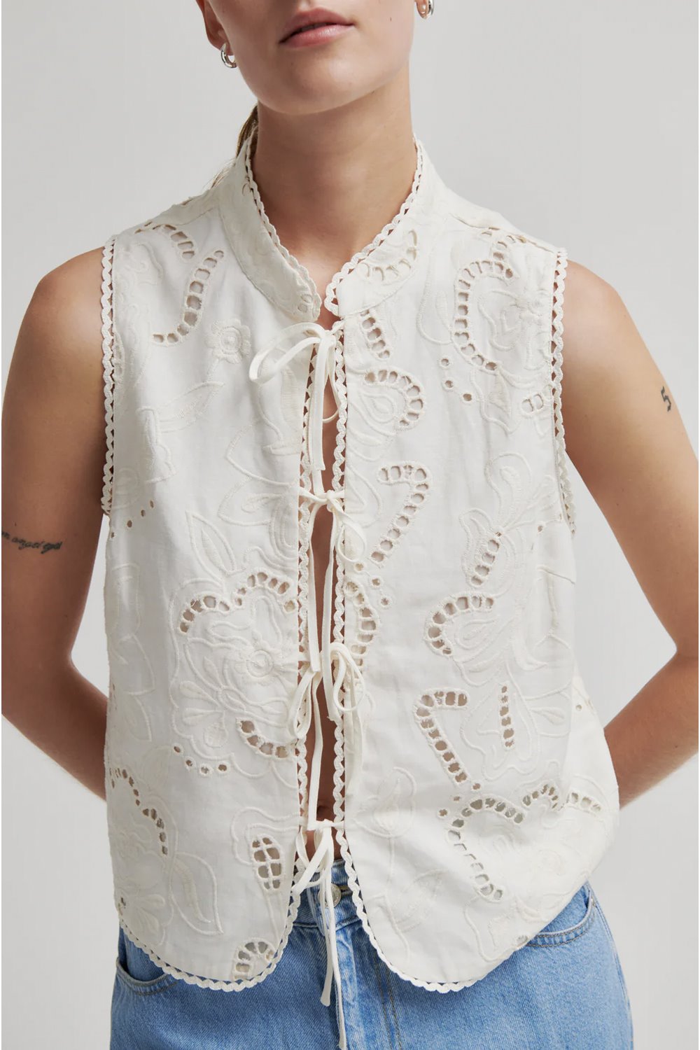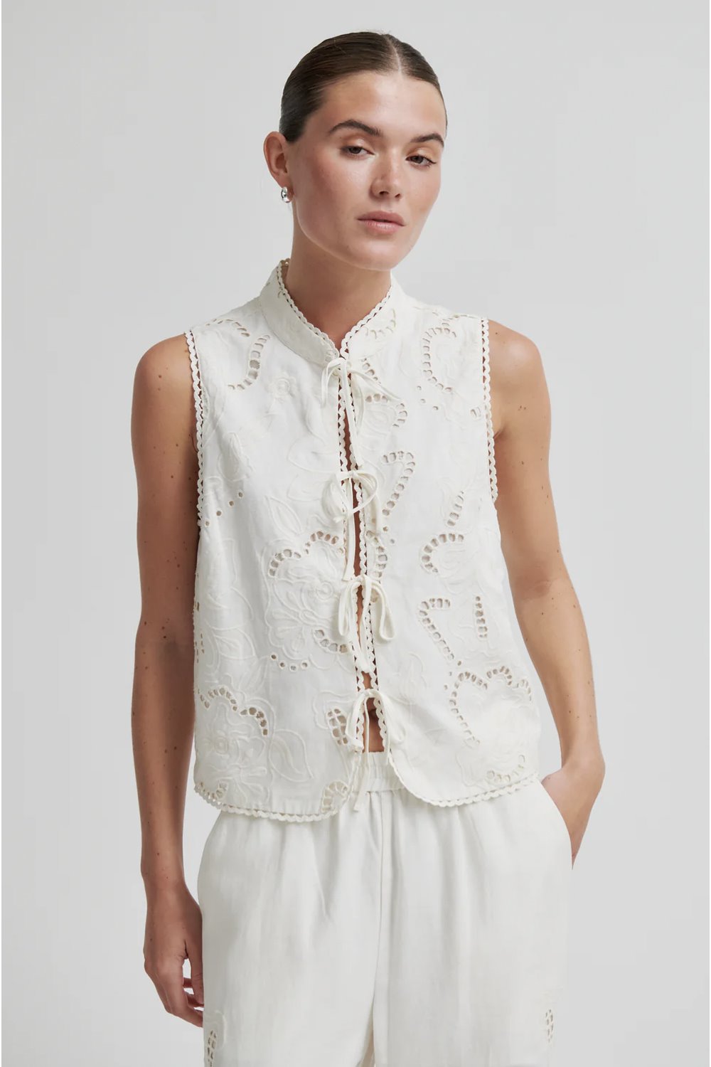 A viscose-linen blend top with cutwork embroidery and tie fronts. With a mandarin collar and scalloped trims. Regular fit.
