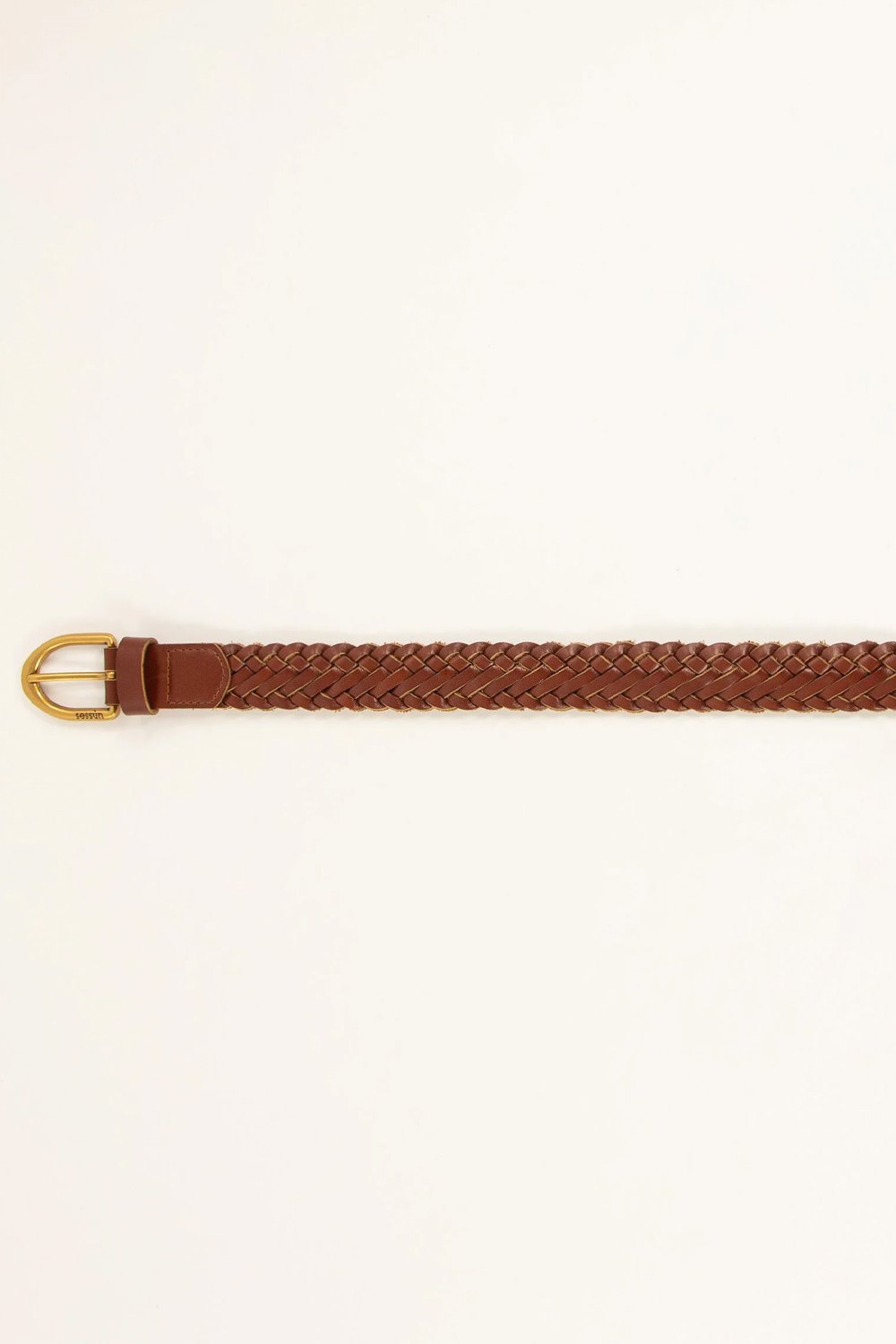 A woven belt in brown leather. With a branded gold-finish buckle.