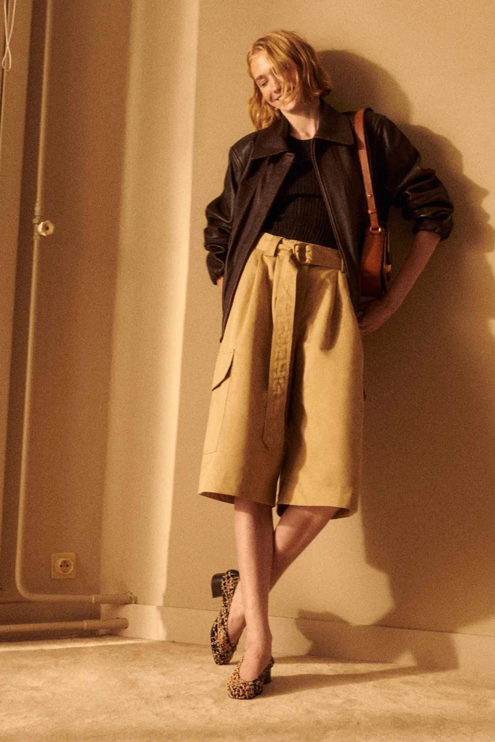 A high-rise cargo-style Bermuda short cut in a tightly woven gabardine twill. Double hook-and-eye closure, interior button and concealed fastening. Removable tieable belt. A loose fit shape works well with a fitted tee or shirt.
