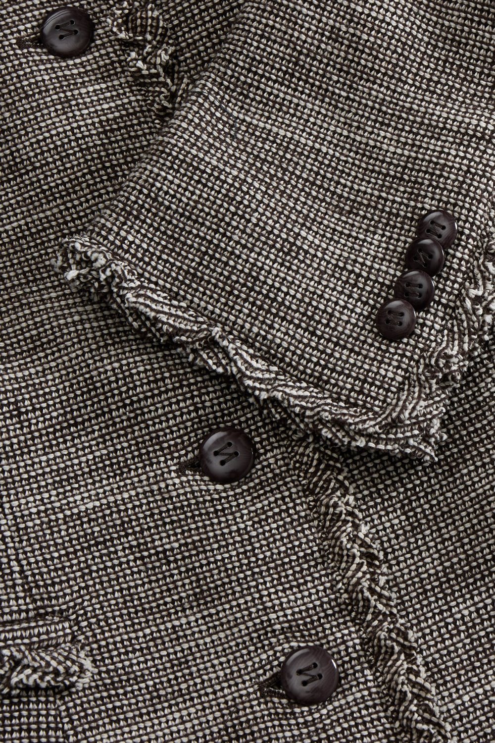 A long line collarless jacket cut in an organic cotton and wool fabric. Button front and raw-edge bias tape around the neck, hem, and cuffs. A tailored, fitted shape.