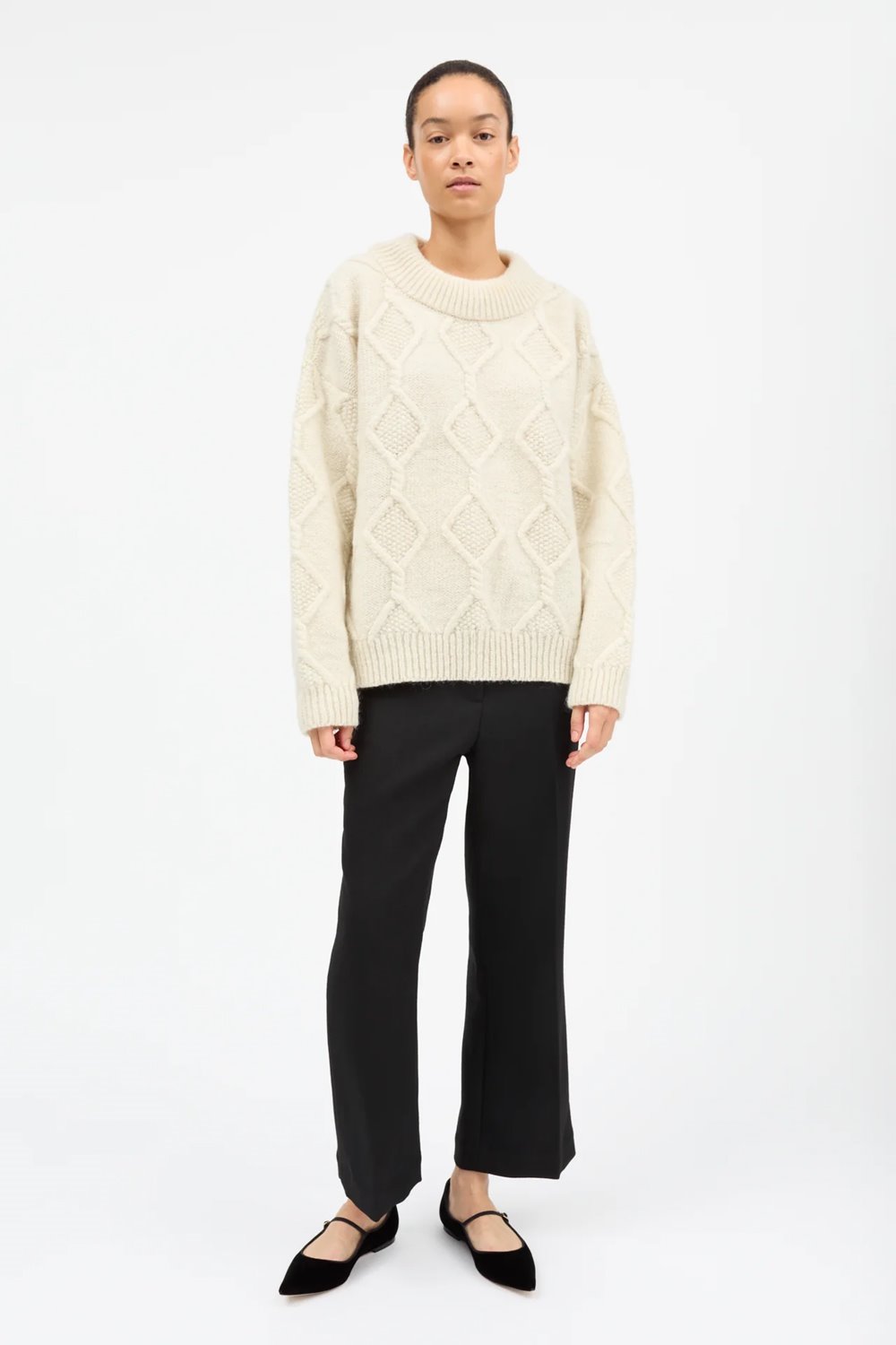 Featuring a classic cable-knit, the design is finished with a round neckline, dropped shoulders, and wide ribbed trims at the cuffs and hem, creating a relaxed yet refined silhouette. The slightly oversized fit makes it perfect for layering.