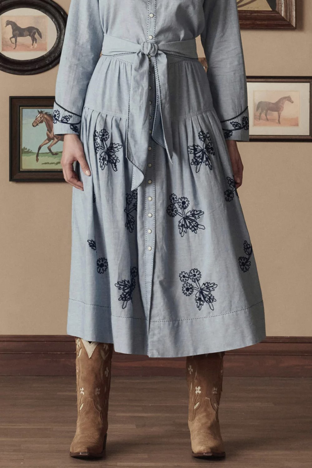 The Chambray Highland skirt is part of The Great's collaboration with Stetson, cut in a lightweight chambray with a soft denim feel. The Silhouette features a dropped waist, soft pleating, and a flowing hem. With an elastic waistband and full front placket finished with classic Western pearl snaps.