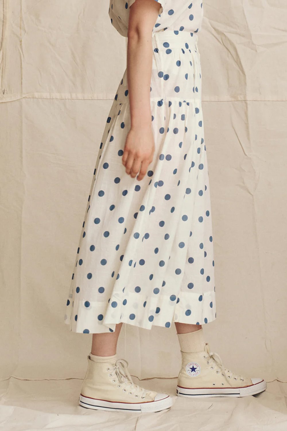 A lightweight cotton skirt with a bit of texture adding a gorgeous drape. With an elasticated waist and flattering drop waist, The Highland skirt is perfect dressed up or down. Shirring button down the front abnd a flowy hem. Cream with blue polka dots.