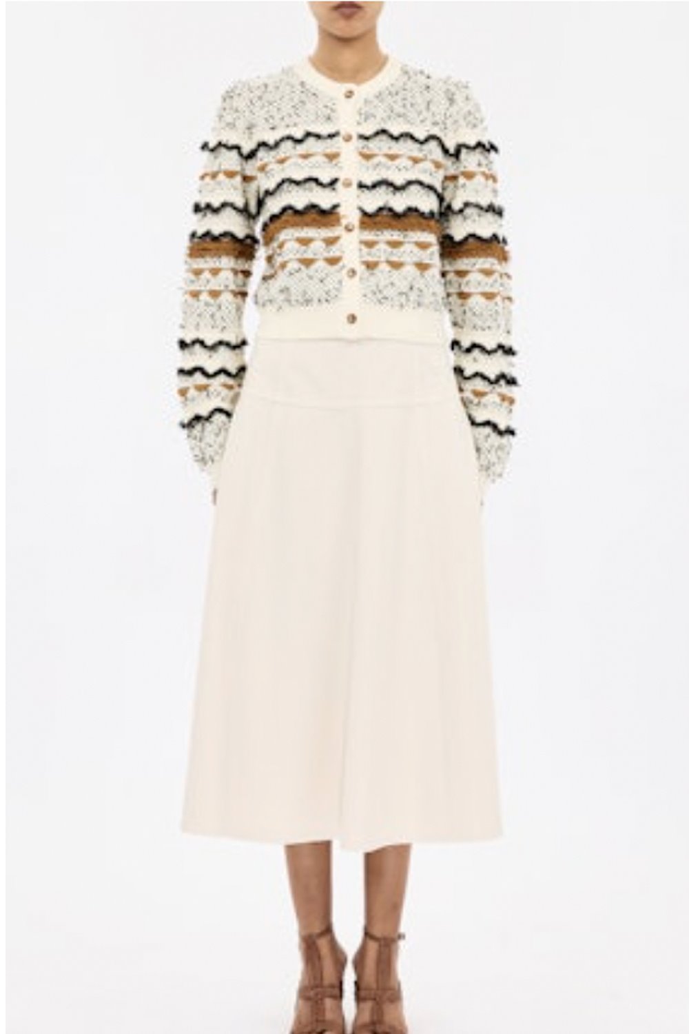 A luxe tweed-inspired cardigan with charming details. Delicate ruffle and striped stitching. Long puff sleeves and metallic threads and finished with tortoiseshell buttons.