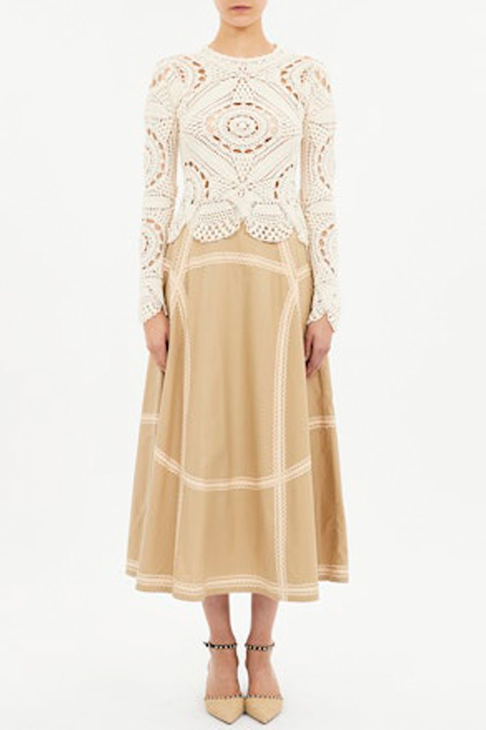 A Midi skirt cut in the brand's water-washed poplin with intricate ric-rac grosgrain ribbon detailing. A sculpted look with timeless appeal. A-line shape and graceful volume at the flared hem. High-rise with a concealed zip fastening.