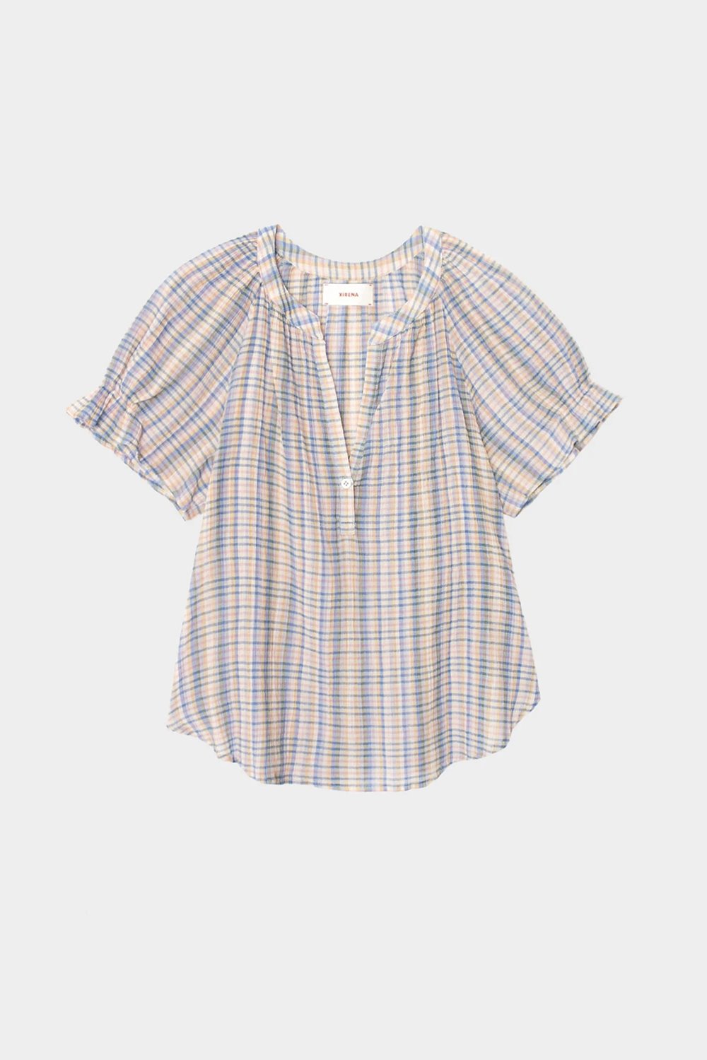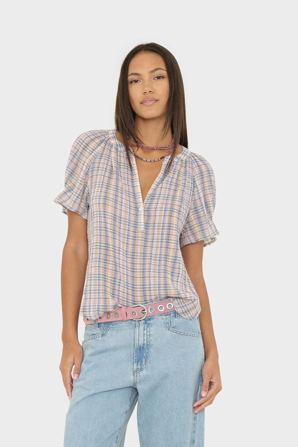 The Astryde is back in a confetti check. A feminine style with a V-neck and single button-closure. Short puff raglan sleeves with elastic ruffle and shirred detailing throughout. Wear with the Alexia skirt in the same print.