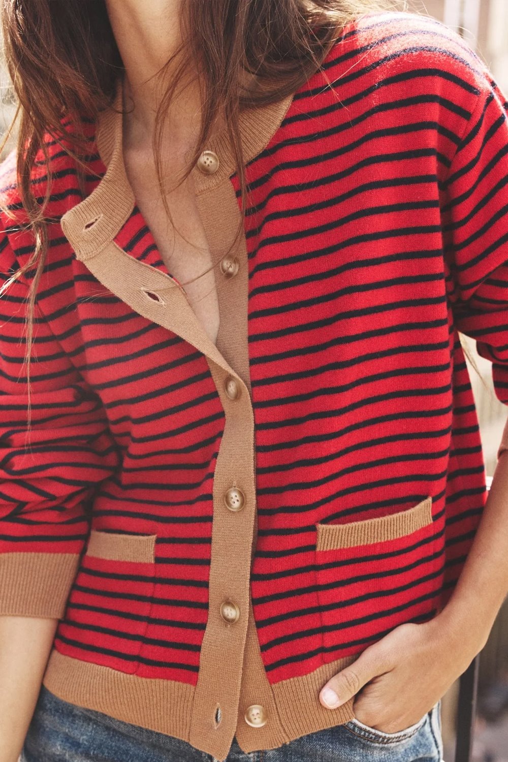 A new Xirena shape, the Lillian is an ultra-soft cashmere/merino blend stripe knit. Featuring a contrast ribbed trim on th cuffs, pockets and hem.