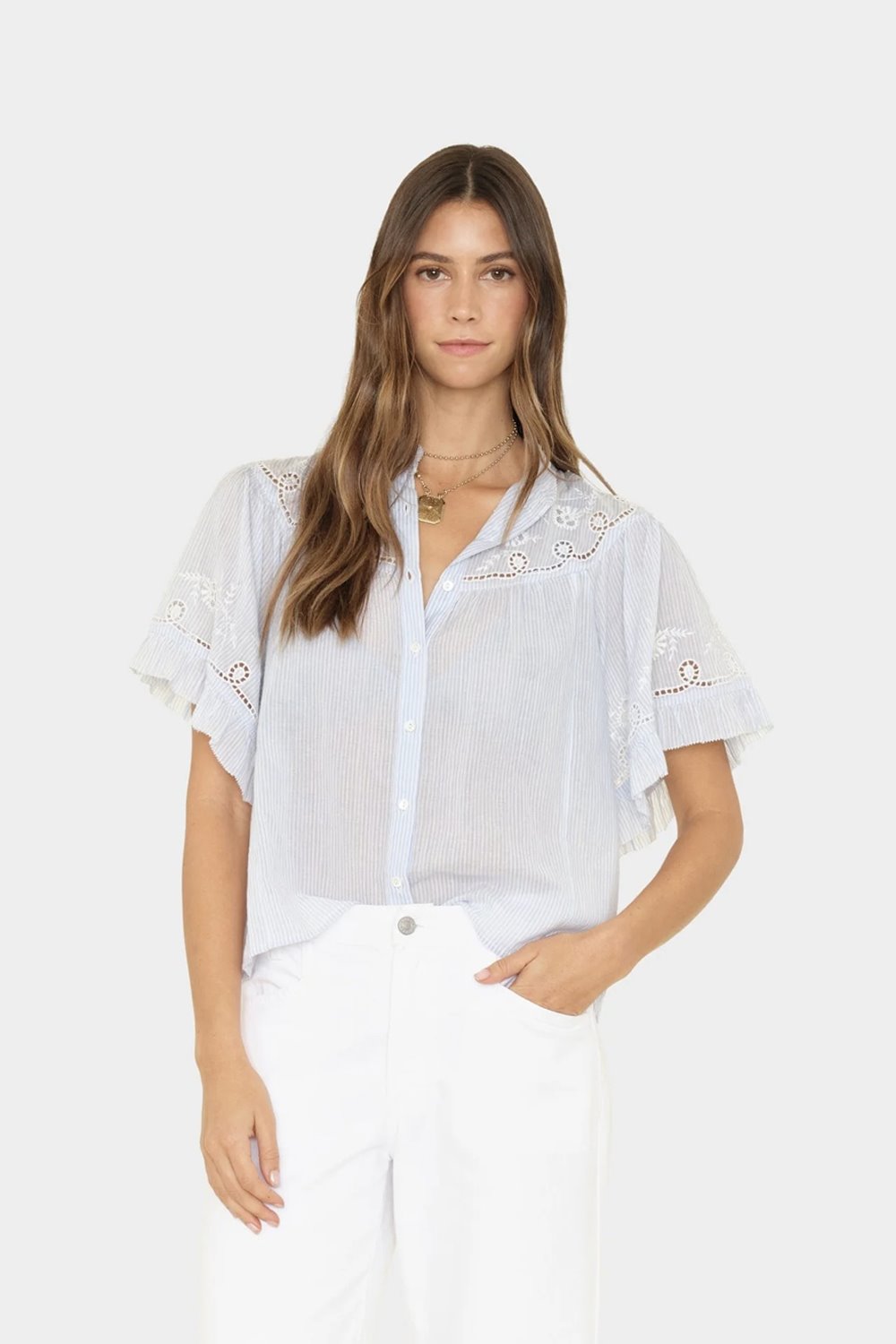 Cut in a superfine cotton voile, the Mae has pretty ruffle details to the collar and cuffs. Intricate embroidery and lace trims throughout. Seen here in a soft blue and white stripe.
