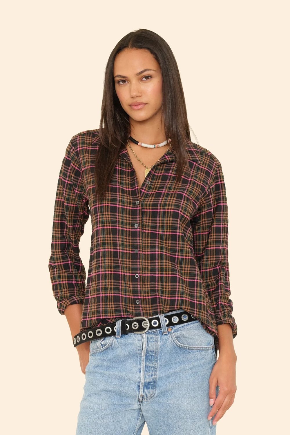The signature Xirena Scout shape, seen here in a soft cotton gauze plaid. Button through front and shirttail hem and box pleat yoke at the back. A relaxed and stylish silhouette.